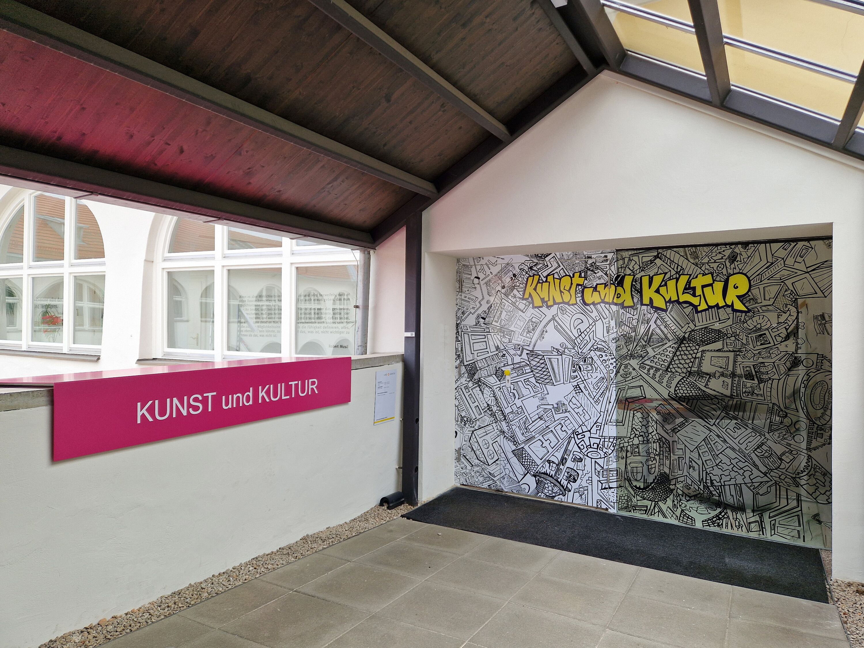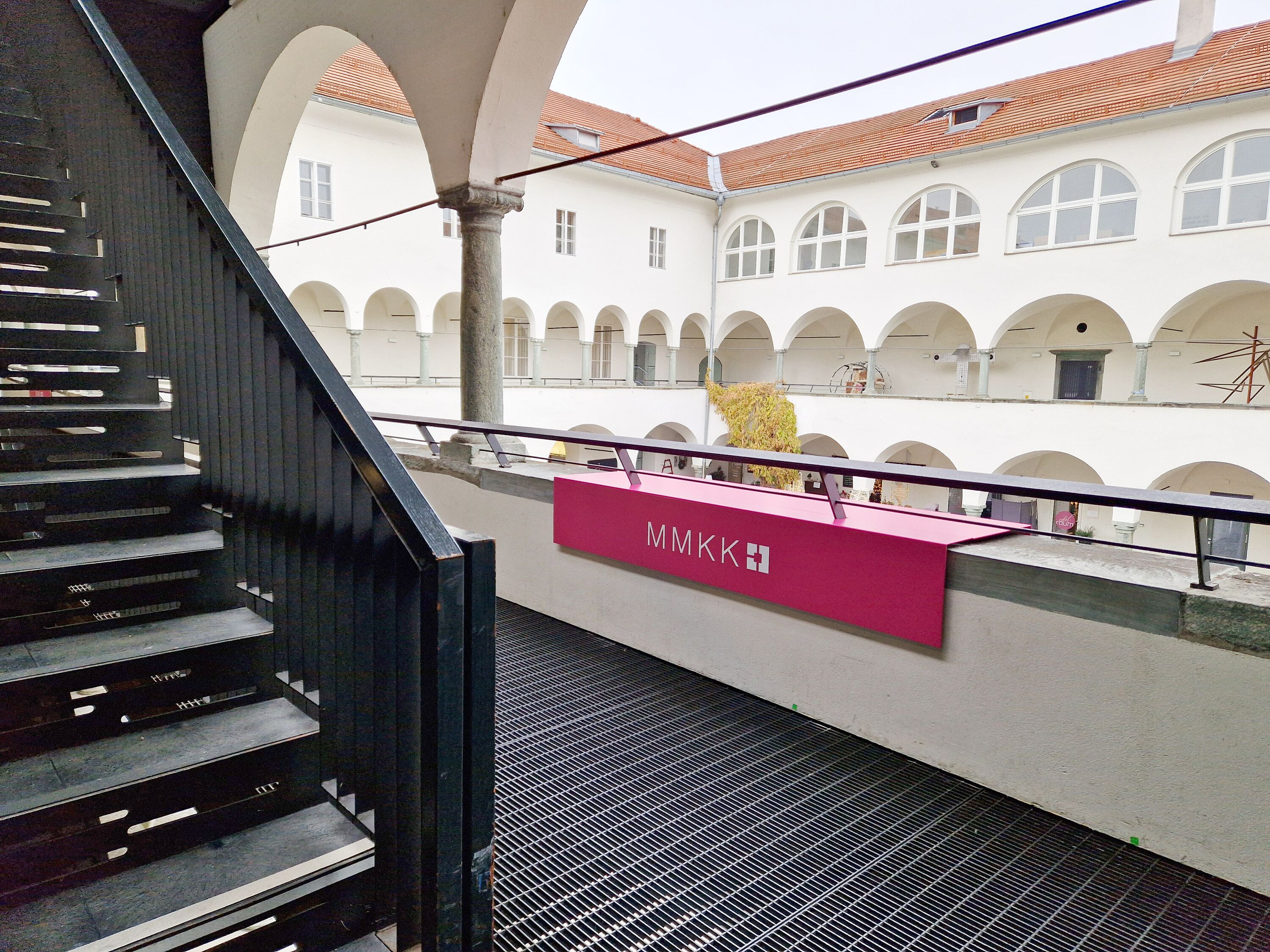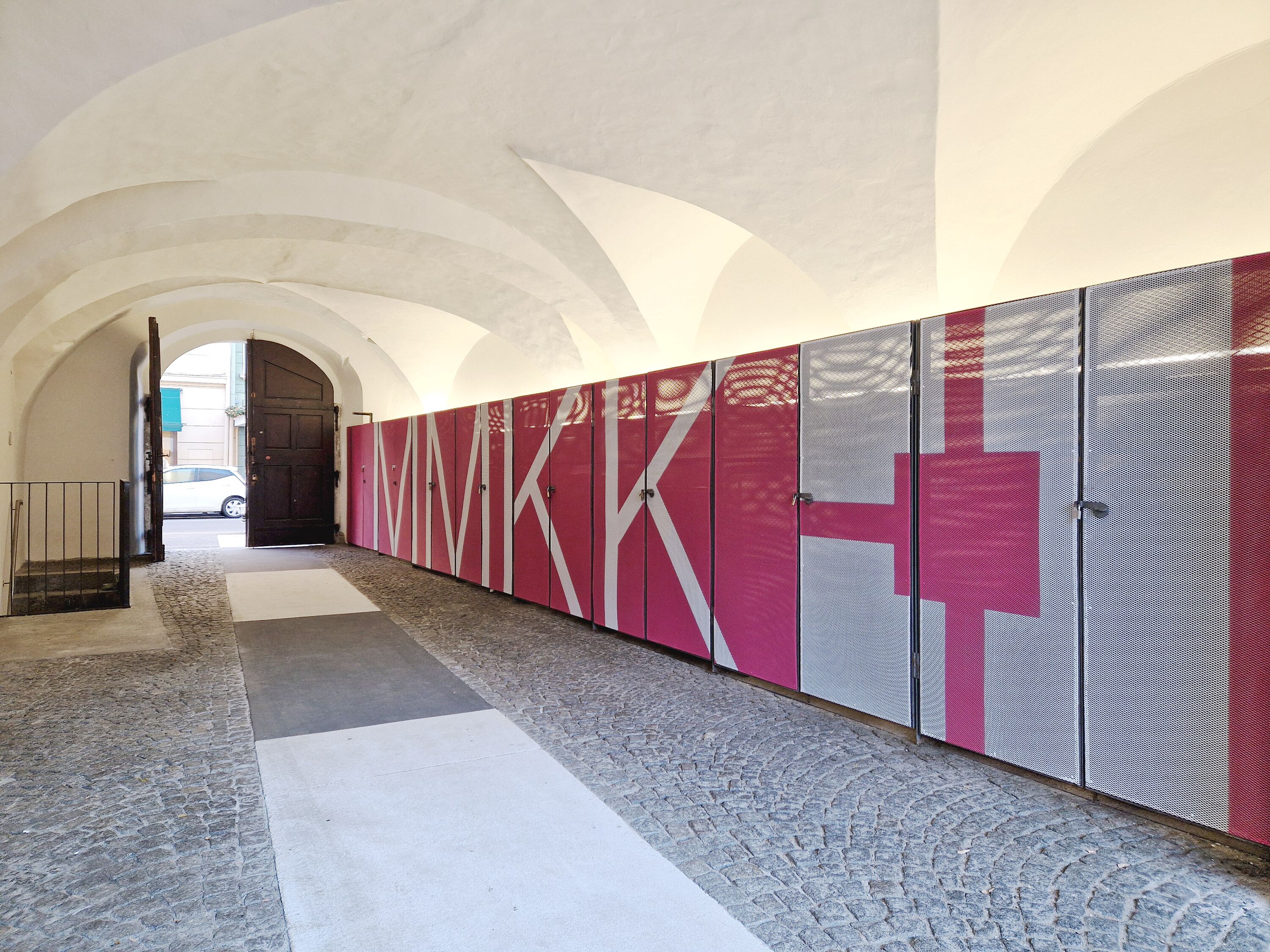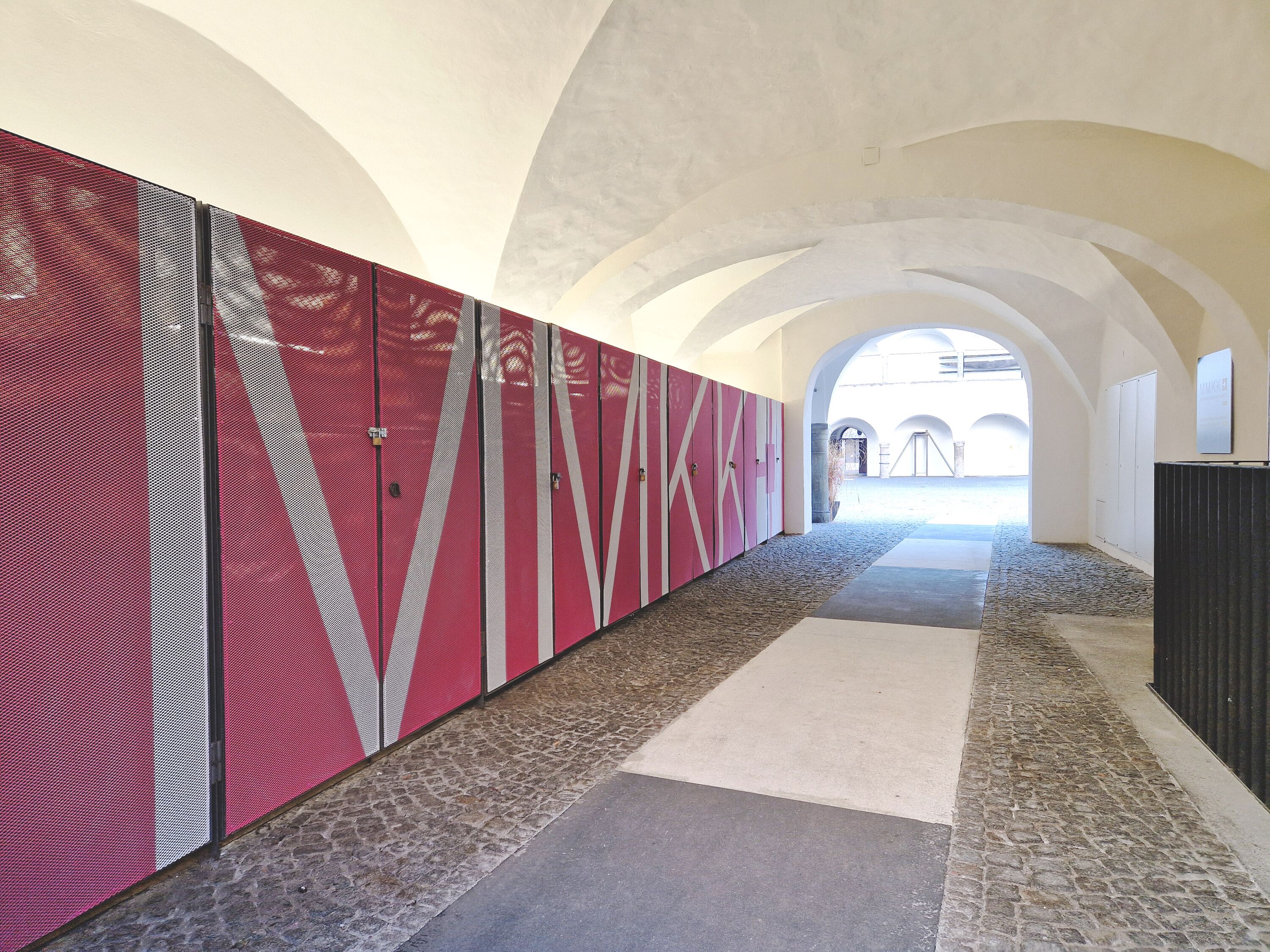 Von der Burggasse kommend leitet ein Info-Screen über den Hofdurchgang mit großflächiger magentafarbigen Wandverkleidung aus Streckmetall (L 13 Meter) mit weißem MMKK-Schriftzug in den Burghof. Drei Aluminium-Konstruktionen in Form von magentafarbigen Flaggen (je H 140 x B 200 x T 60 cm) an der Brüstung im 1. und 2. Geschoss markieren und kennzeichnen mit den Aufschriften MMKK, KUNST und KULTUR die aufzusuchenden Örtlichkeiten und geben diesen eine weithin sichtbare Präsenz. Beschriftungstafeln und Wandbilder verweisen auf das aktuelle Ausstellungsprogramm von MMKK und Burgkapelle. Von der Domgasse kommend werden Passant*innen mittels eines Werbeleuchtkastens (H 380 x B 135 cm) und einer schwarz/weißen zusätzlichen Fassadenbeschriftung zum Besuch in die Burg eingeladen.
